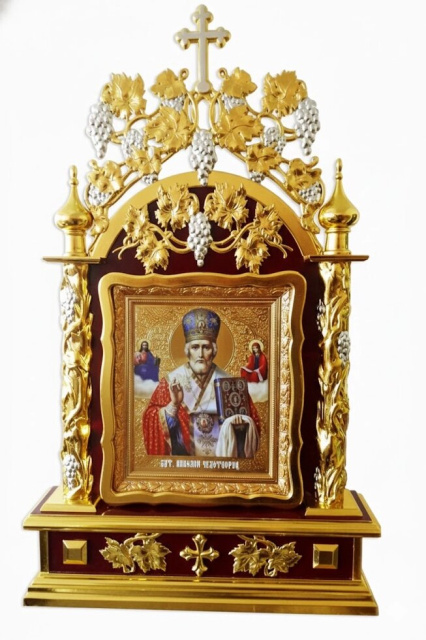 Виносна ікона виготовлена з дерева та міцної фанери, забарвлена в білий колір. Прикрашена різьбленням з позолотою та різними колонами.