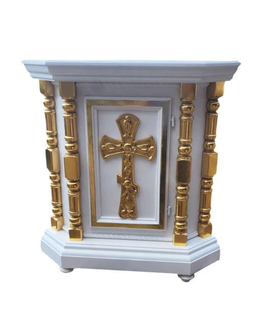 Елегантний кутовий жертовник, виготовлений у класичному церковному стилі. Основа білого кольору прикрашена золотими елементами — різьбленими колонками та рельєфним хрестом на центральних дверцятах. Завдяки трикутній формі легко розміщується в кутку храму, економлячи простір та гармонійно вписуючись в інтер’єр.
