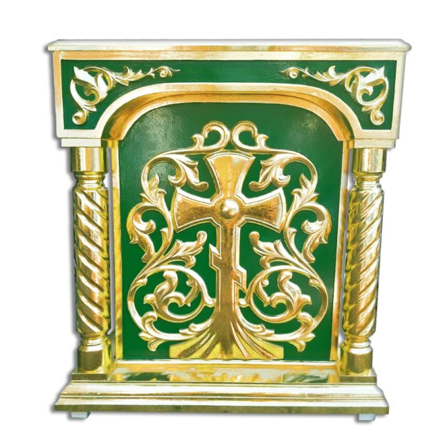 центральний аналой чи тетрапод - має об'ємну форму, прикрашений масивними колонками та центральним, вишукано орнаментованим хрестом. Ідеально підходить для покладання храмової ікони чи Євангелія;