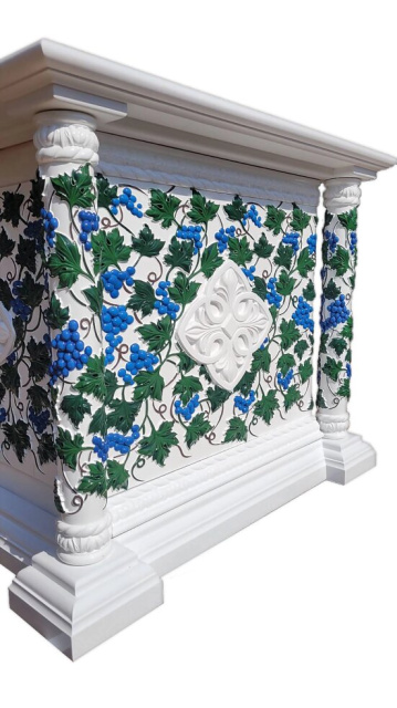 - Оздоблення: різьба з липи, 4 різьблені колони, покриття тонованим лаком, ручний розпис італійськими фарбами