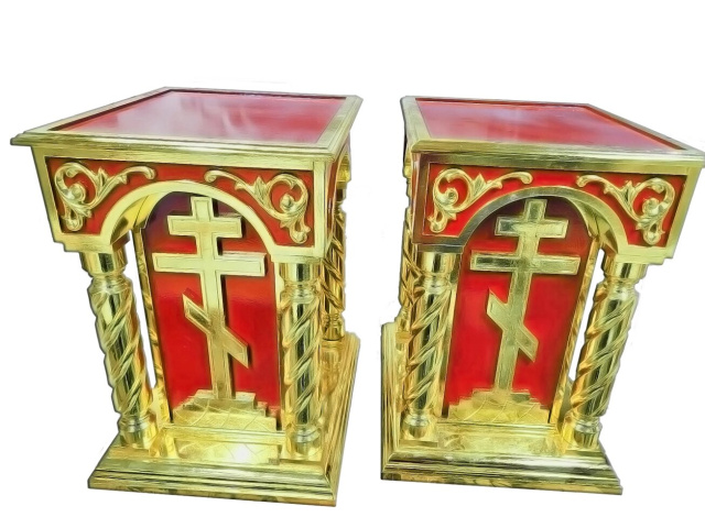 Підставка виготовлена із міцної фанери та дерева. Декорована різьбленими хрестами, різьбленим декором та точеними колонами.Тонована лаком. Покриття позолотою...